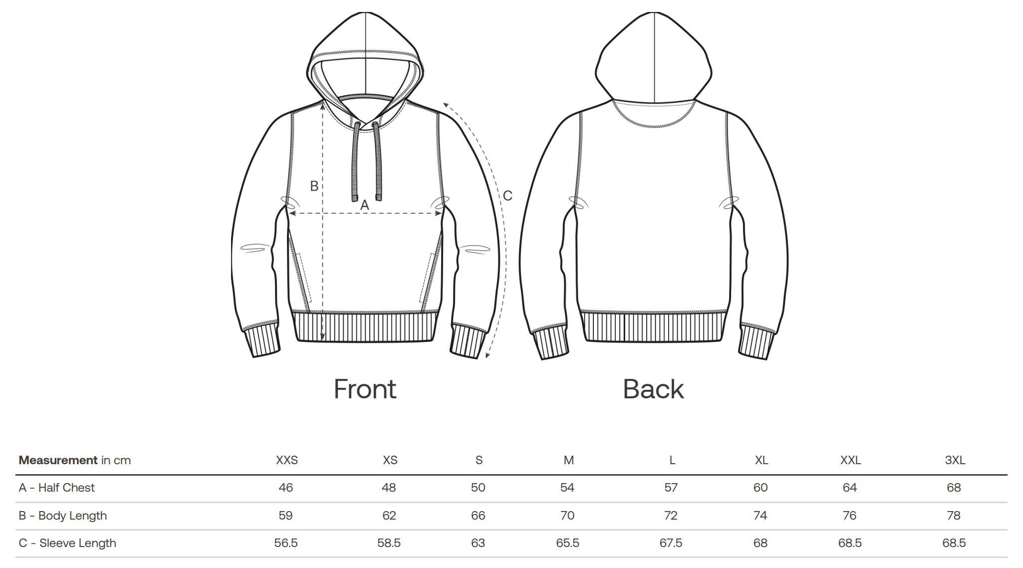 XS, S, M, L, 2XL, 3XL